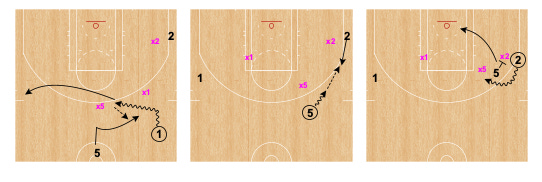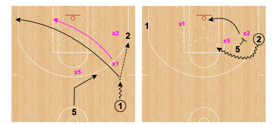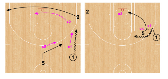 5 then hits ahead to Player 2 blasting out of the corner. 5 follows pass to side ball screen for 2. Once again, play is live at the ball screen.
