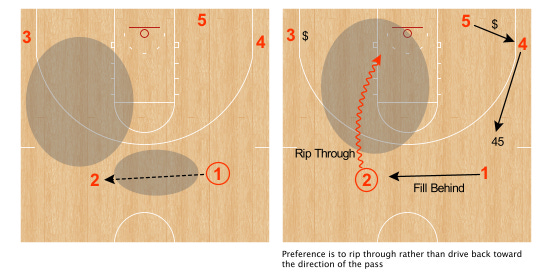 Player 2 above may drive into a help defender. Knowing they have a teammate filling behind, they can stride stop, pivot and hit the teammate in their taillights.