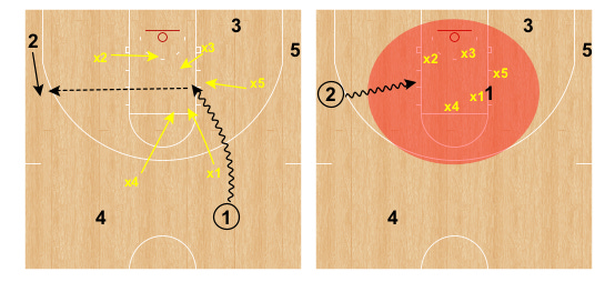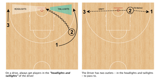 Our first objective: when a player is driving the ball they will know exactly where their four teammates will be. This situation is rehearsed and repped until it becomes second nature. Two of those outlets on a baseline drive are depicted above. Player 3 is in the headlights of the driver and Player 1 cuts into the taillights of the driver.