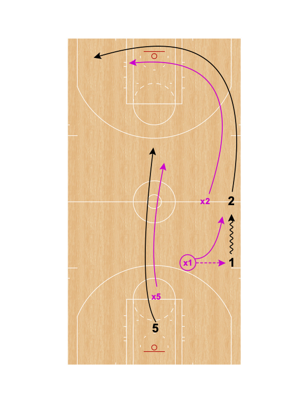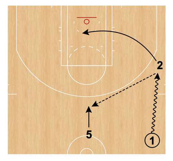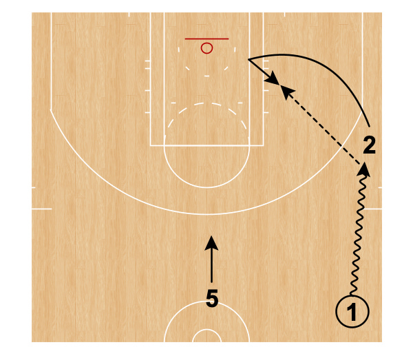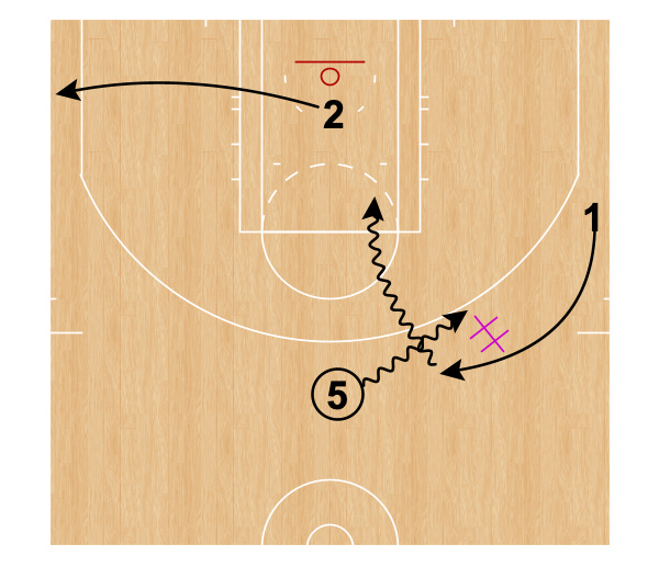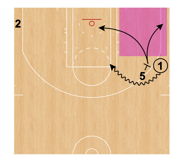 Player 5 immediately dribbles at Player 1’s defender and Player 1 comes over the top for the handoff.