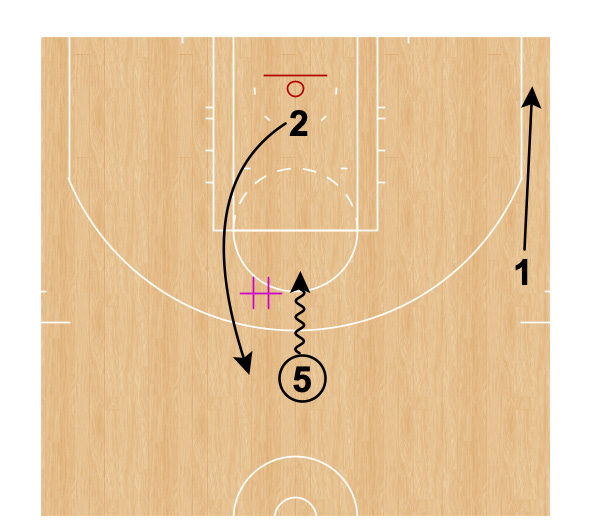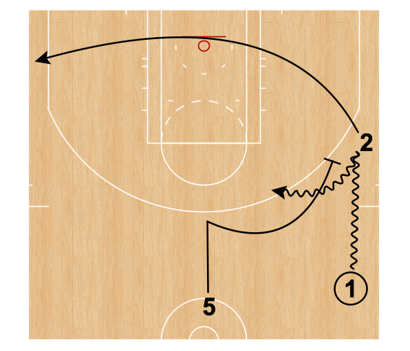 Player 2 pushes through as Player 1 dribble advances. The trail player, Player 5 in Fig. 2 above, wing ball screens for Player 1.